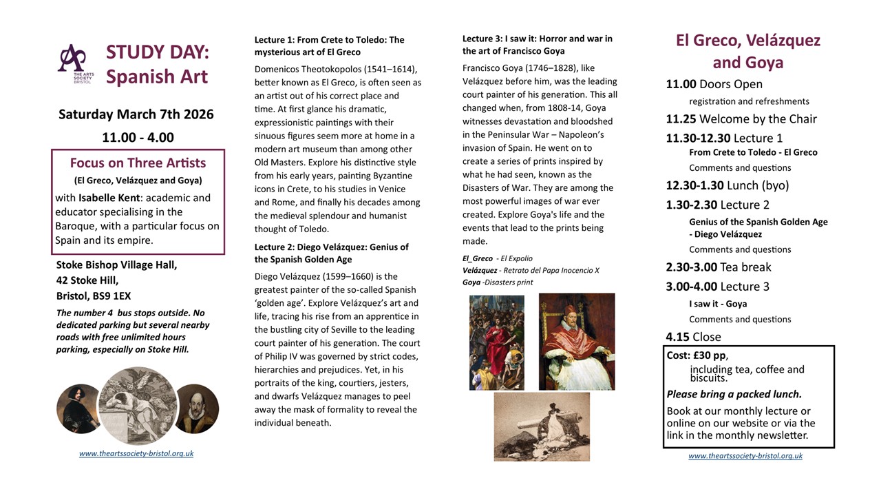 Study Day: Spanish Art on MARCH 7th, £30 per person to include tea/coffee and biscuits. Click here for details.